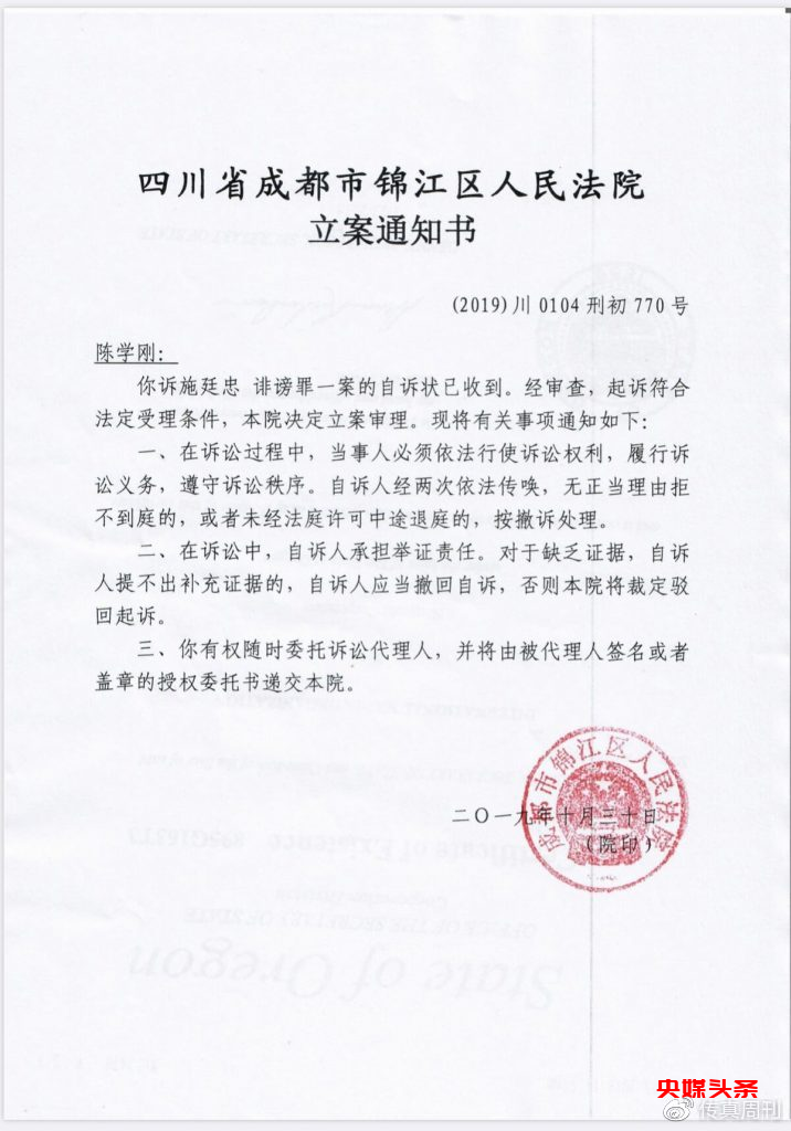 国际新闻网消息(编辑 李志强)10月30日,成都市锦江区人民法院发出中国记录通讯社社长陈学刚起诉施廷忠诽谤罪一案立案通知书。