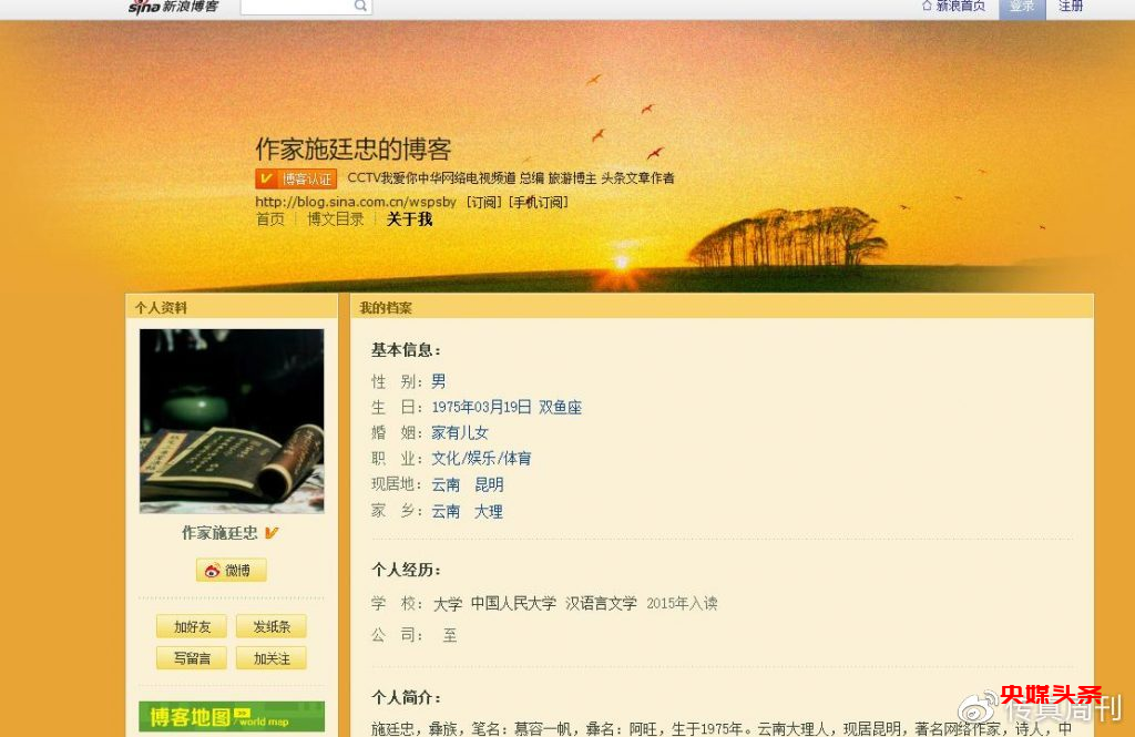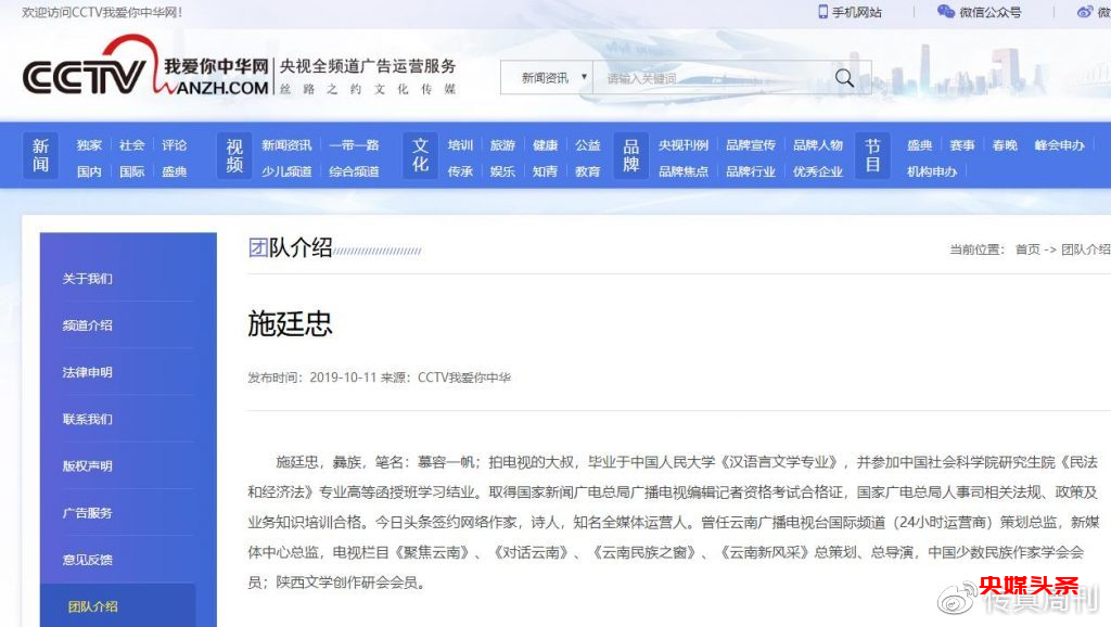 被告人施廷忠微博认证是CCTV我爱你中华网络电视频道总编。该被告在网络上发布多篇捏造、虚假信息诽谤中国记录通讯社、国际媒体组织等机构及个人,对中国记录通讯社、国际媒体组织及陈学刚本人声誉造成极大破坏,影响中国记录通讯社所承办、主办的多项活动的正常进行,陈学刚为维护中国记录通讯社及自身的各项合法权益,拿起法律武器,将被告人违法犯罪证据提交至人民法院,法院将展开审理工作,维护公民的合法权益。