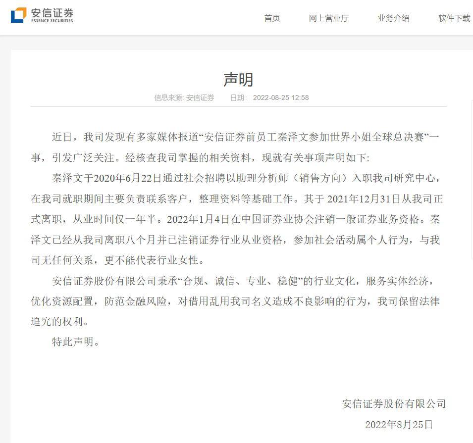 安信证券 8 月 25 日发布声明称,经核查公司掌握的相关资料,秦泽文于 2020 年 6 月 22 日通过社会招聘以助理分析师 ( 销售方向 ) 入职公司研究中心,就职期间主要负责联系客户,整理资料等基础工作。其于 2021 年 12 月 31 日正式离职,从业时间仅一年半。2022 年 1 月 4 日在中国证券业协会注销一般证券业务资格。秦泽文已经从公司离职八个月并已注销证券行业从业资格,参加社会活动属个人行为,与公司无任何关系,更不能代表行业女性。