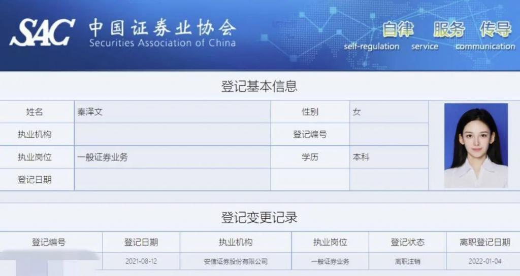 据媒体报道,中国证券业协会网站公示的登记信息还显示,秦泽文曾供职于安信证券,登记时间为 2021 年 8 月 12 日至 2022 年 1 月 4 日,共 4 个多月。但秦泽文的执业岗位为 ” 一般证券业务 “,并未取得分析师资质。