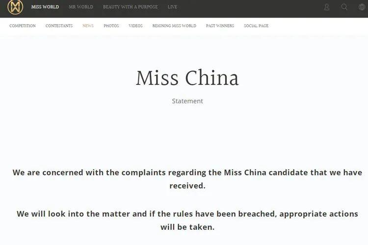 世界小姐官网 8 月 24 日发布声明称,对收到的有关世界小姐中国区候选人的投诉表示关注,并将调查此事,如果违反规定,将采取适当行动。