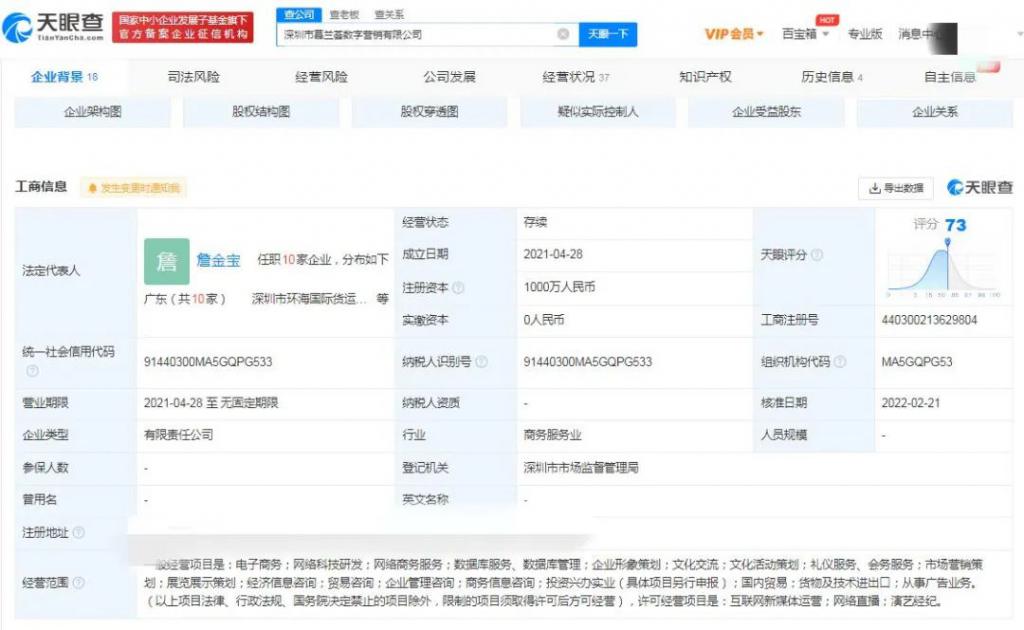 而深圳市慕兰荟数字营销有限公司成立于 2021 年 4 月 28 日,法定代表人为詹金宝,注册资本 1000 万元。