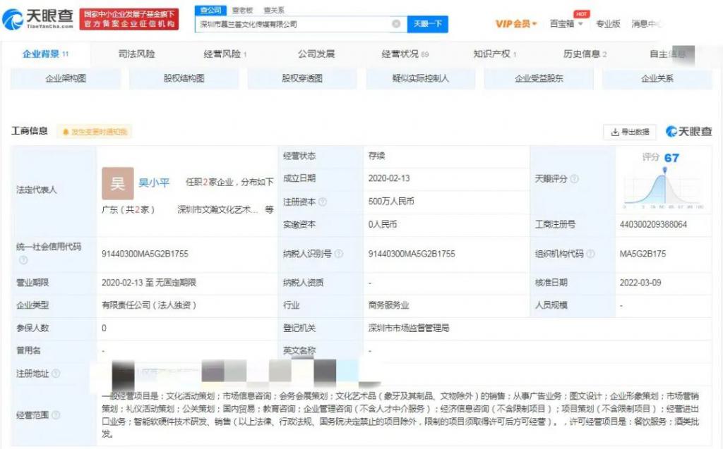 国家企业信用信息公示系统显示,深圳市慕兰荟文化传媒有限公司成立于 2020 年 2 月 13 日,法定代表人为吴小平,注册资本 500 万元。因通过登记的住所或经营场所无法联系,该公司于 2022 年 2 月 9 日,被深圳市市场和质量监督管理委员会南山局列入经营异常名录。