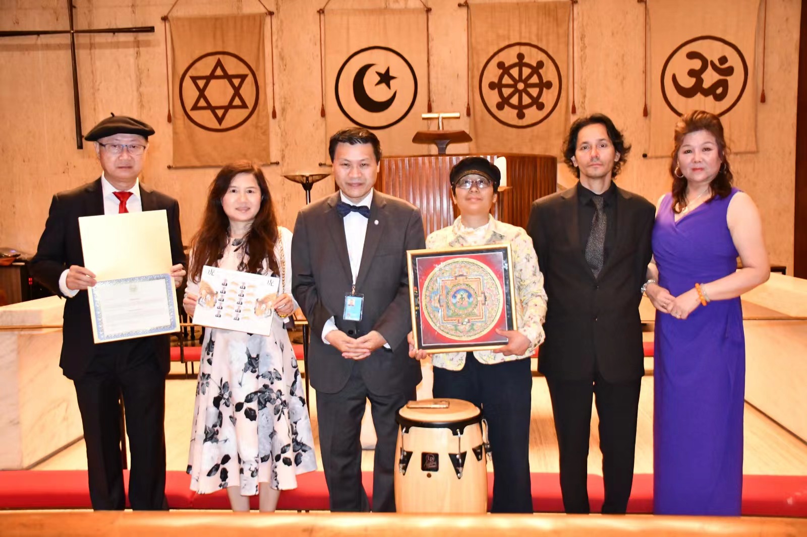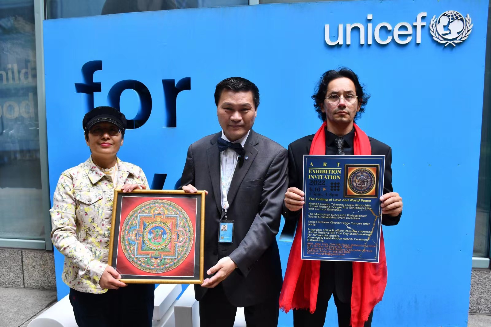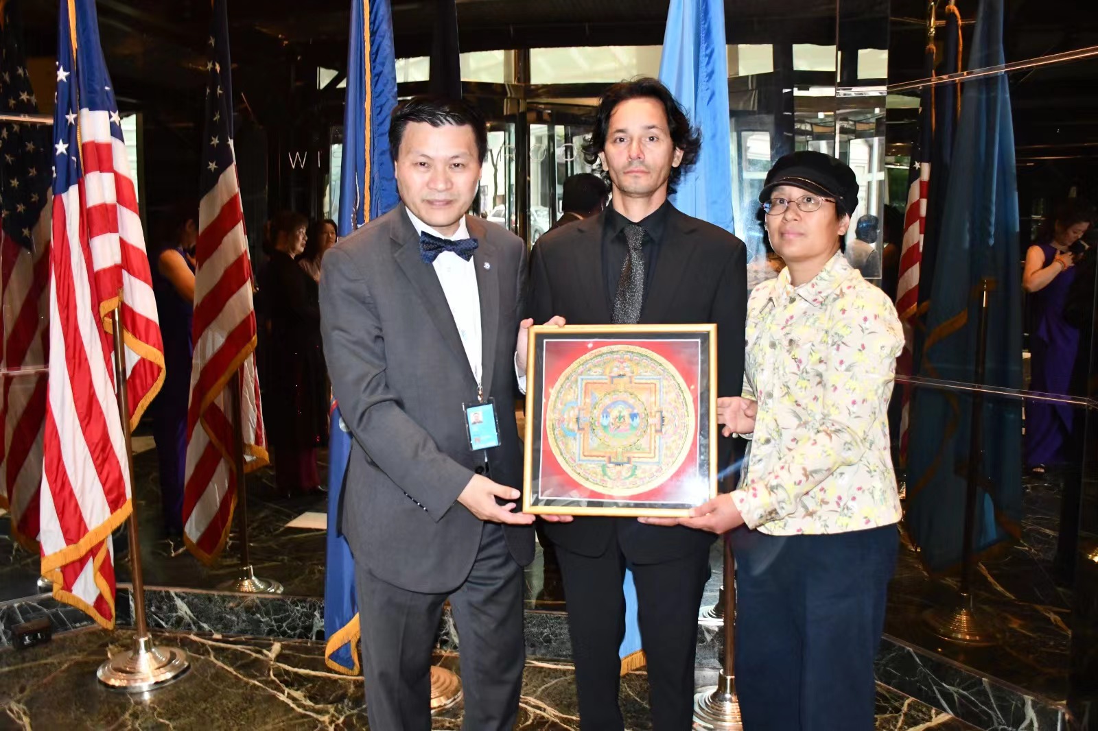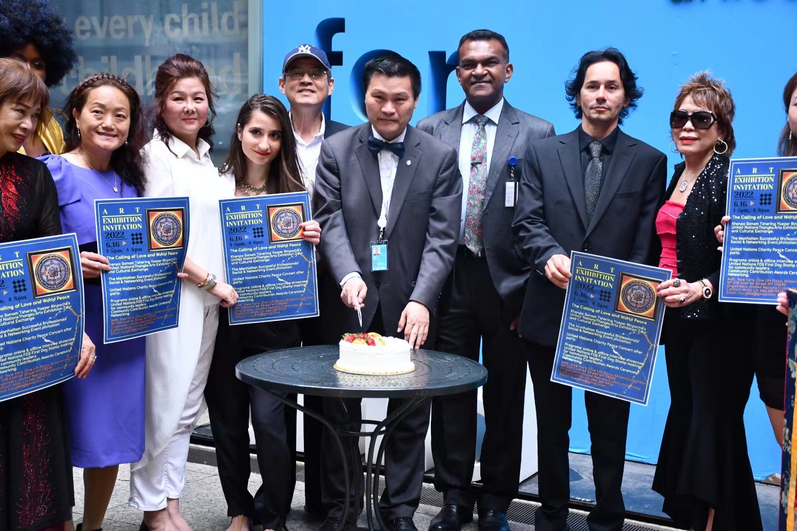On Thursday, June 16, 2022, Chairman Andy Lin of United Nations Commutech Group hosted a press conference at the United Nations Plaza in Manhattan and formally announced Khenpo Sonam Tshering Yoezer Rinpoche’s United Nations Thangka Arts Exhibition Tour and Cultural Exchange Events which will start in early August 2022 in New York City. Venerable Khenpo Sonam Tshering Yoezer Rinpoche has been specifically trained in Thangka painting in Bhutan. His Thangka paintings have received great appreciations and admiration by many from different ethnic and cultural backgrounds worldwide and have brought auspicious energy to those who came into contact with him or his Thangka paintings. Chairman Andy Lin presented the invitation letter from United Nations Commutech Group to invite Venerable Khenpo Sonam Tshering Yoezer Rinpoche to come to the United States in this August to co-host the United Nations Thangka Arts Exhibition Tour and Cultural Exchanges with United Nations Commutech Group. Several precious Thangka paintings from Venerable Yoezer Rinpoche were displayed at the press conference. The press conference was well attended by distinguished guest Major General Harindra Peiris RWP RSP USP ndu Minister-Military Advisor from Sri Lanka’s Permanent Mission to the United Nations, successful professionals, and friends from all walks of life on this very auspicious day. United Nations Commutech Group has hosted several United Nations Charity Peace Concert this year. A celebration party for the successful completions of these concerts was hosted in conjunction with the press conference in recognition of those who have selflessly contributed to the successes. United Nations FDS First Day Stamp and Community Contribution Award were especially presented to musician Yu Wang for his contributions in promoting love and world peace and cultural exchanges in correspondence to the United Nations 17 Sustainable Development Goals. Chairman Andy Lin also extended his invitation to everyone who would like to join them at the United Nations by sharing ideas, talents and resources for world peace.