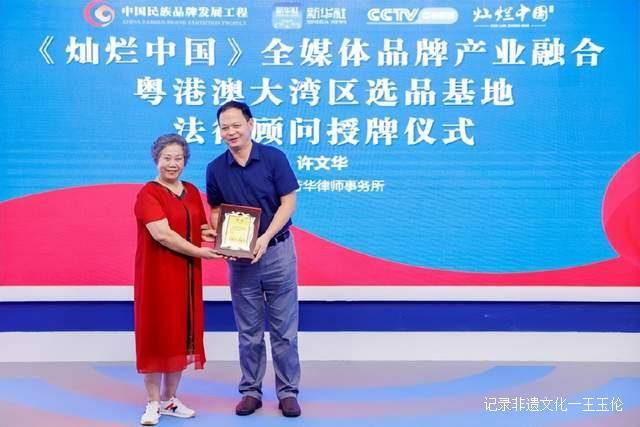 由中华母亲讲堂发起人、中国最美妈妈、《灿烂中国》栏目文化总顾问刘冰先生为广东芳华律师事务所主任许文华颁发法律顾问牌匾,同时广东芳华律师事务所也成为《灿烂中国》全媒体品产业融合粤港澳大湾区选品基地法律服务机构。